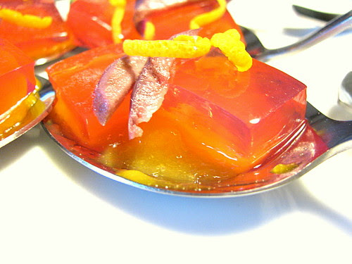 Tagliare lo spritz solido all’interno del contenitore, e con l’aiuto di un coltellino prelevare i cubetti che andranno sistemati sopra i cucchiai contenenti la gelatina di arancia (che rimane “tremula” assolutamente non gommosa…si scioglie in bocca) Decorare ogni cucchiaio con fili di buccia d’arancia e olive a pezzetti. Sistemare i cucchiai in frigorifero per servirli poi ben freddi.
